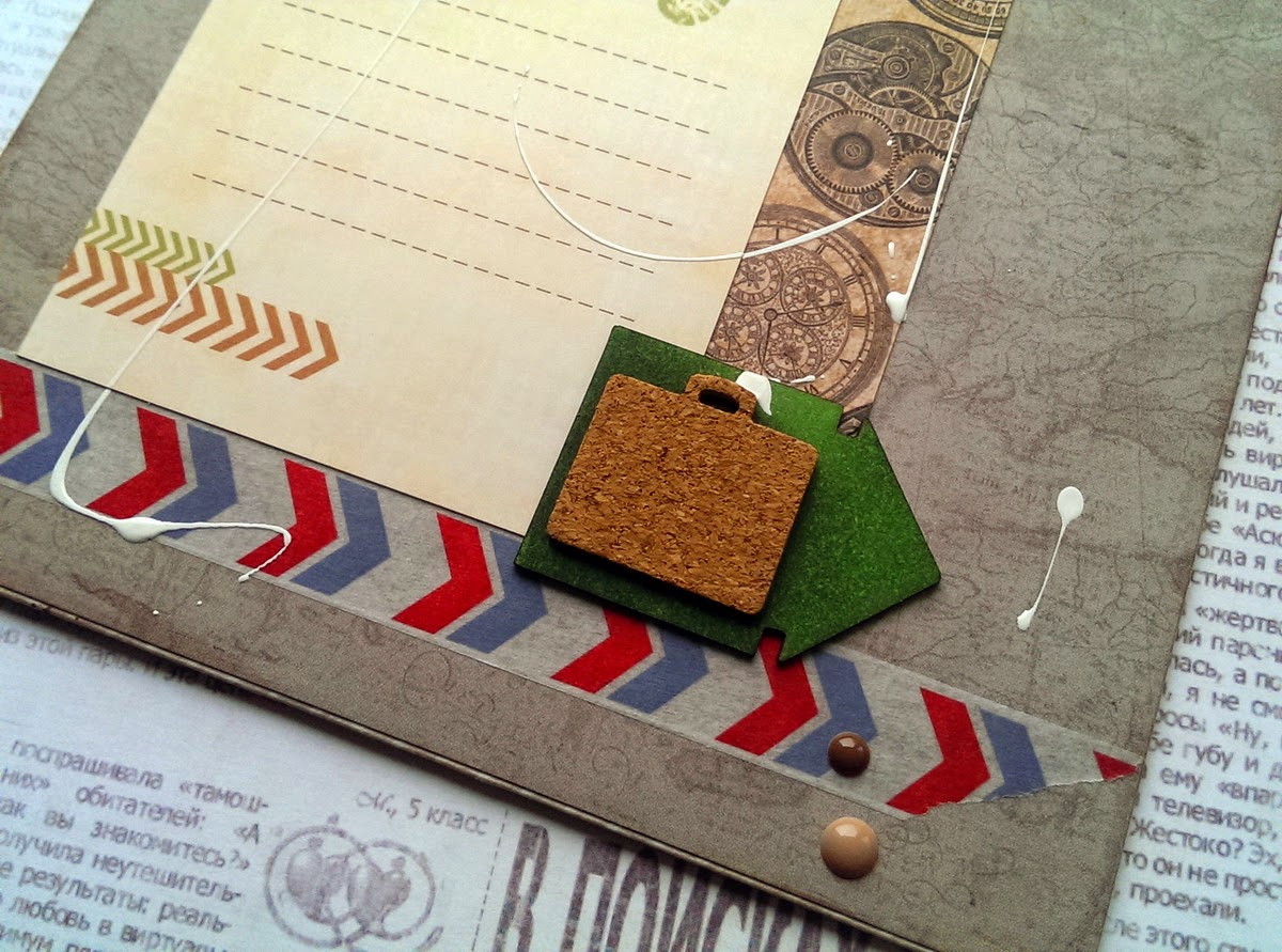 Самолет и чемодан - вырубка из пробкового листа. Стрелочка - чипборд Wicynanka, окрашенный алкогольными чернилами: