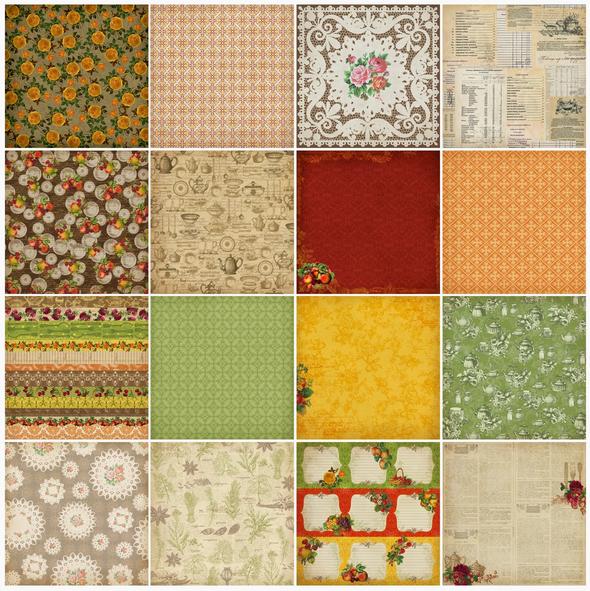 Идеально подойдет для любых работ на тему еды и готовки, кулинарных книг, ретро открыток и страничек. Универсальные фоновые листы и цветочно-фруктовые принты станут основой для летних альбомов.